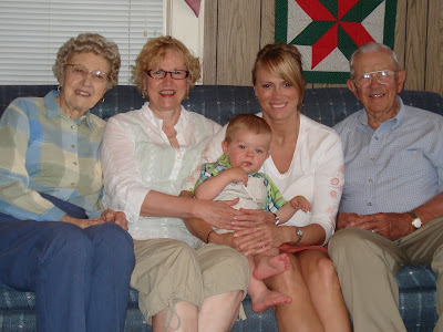 On Tuesday, the boys' Great-Grandma King was welcomed into heaven. She died peacefully at a beautiful hospice facility near her home in North Carolina. I am thankful that despite the distance that separated us, she was able to meet both of her great-grandsons: Cole in June of 2008 and both boys this past May, when Grant was just 6 weeks old. She lived a long, full life of 88 years and will be missed here on Earth. She was a spitfire down here, so I am sure the other angels have their hands full with the new feisty one! We will miss you Grandma!